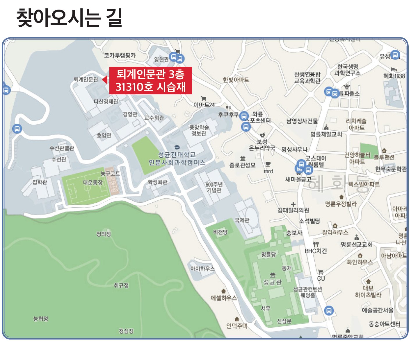 - 4호선 혜화역 1번 출구로 나와 종로08번 마을버스로 환승 (명륜시장.성대후문에서 하차 후 후문 엘리베이터를 이용해 학교 진입)