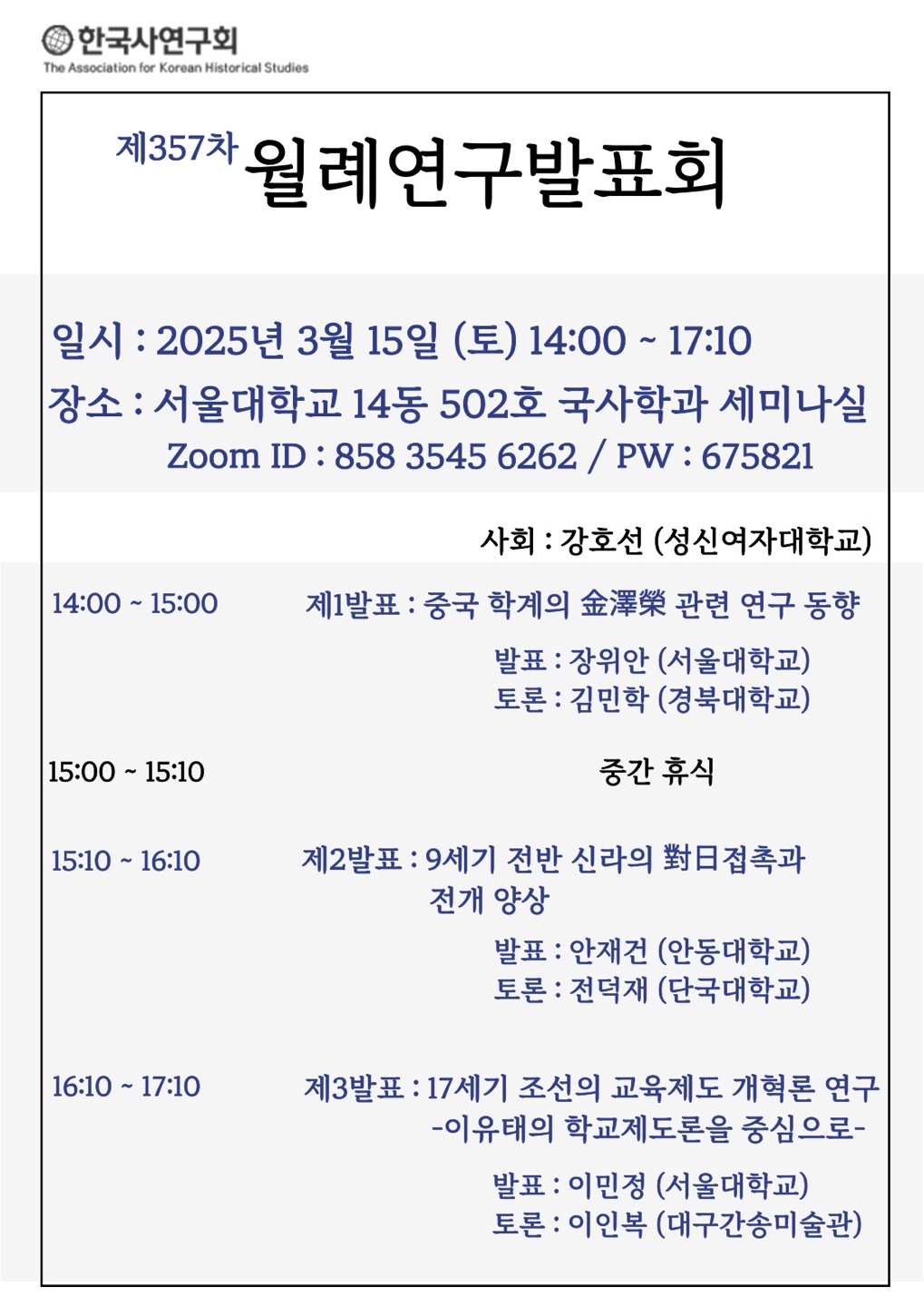 2025년 03월 한국사연구회 제357차 월례연구발표회에 대해 안내드립니다.