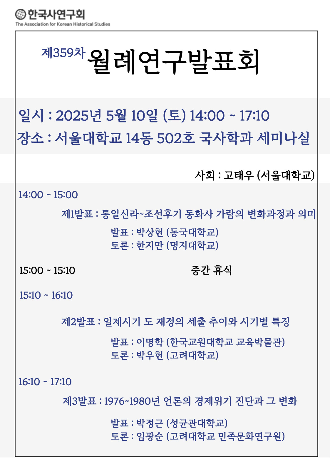 2025년 05월 한국사연구회 제359차 월례연구발표회에 대해 안내드립니다.