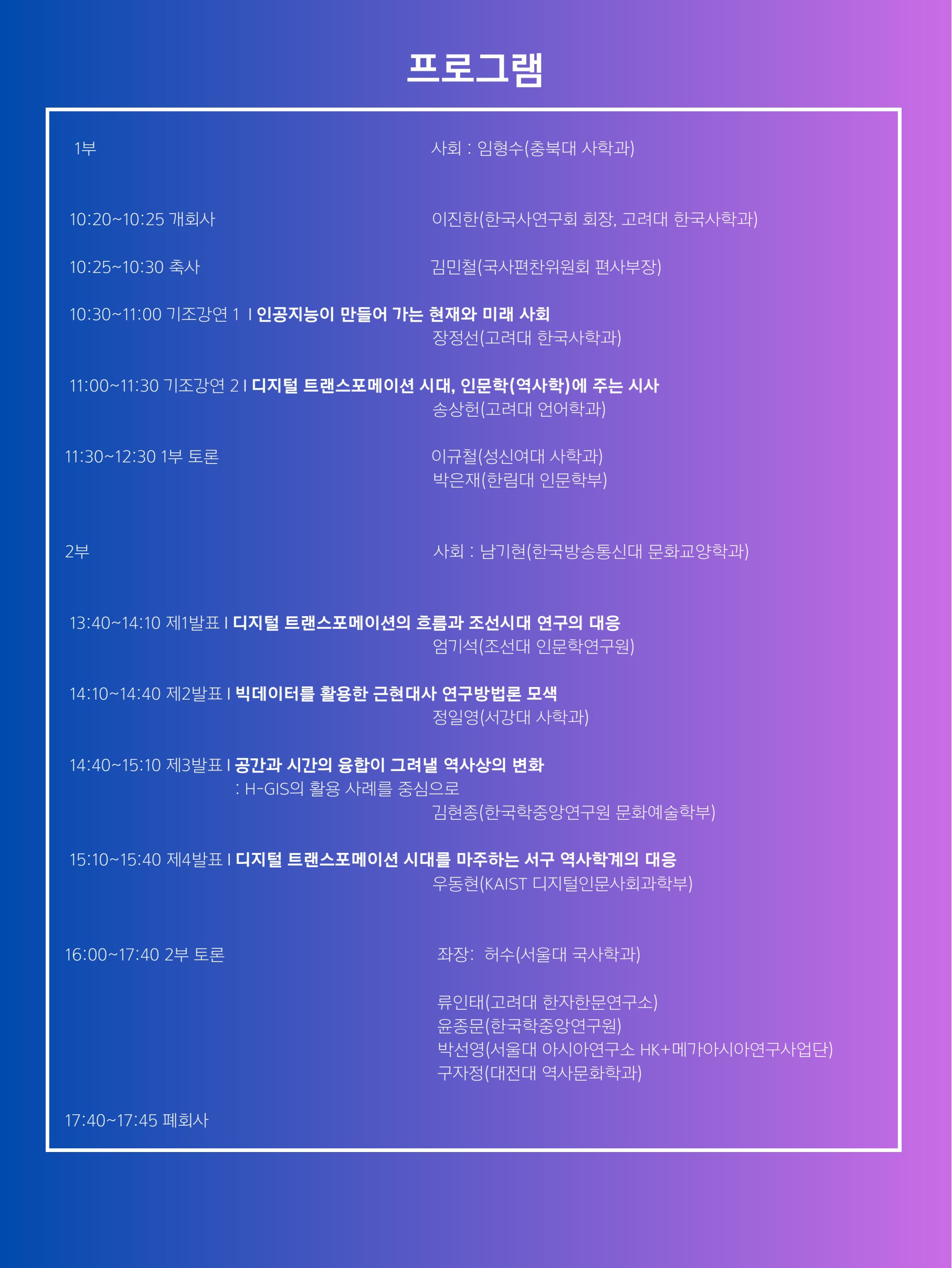 한국사연구회 주관, 국사편찬위원회 후원 학술회의 '디지털 트랜스포메이션(Digital Transformation) 시대와 한국사의 미래'