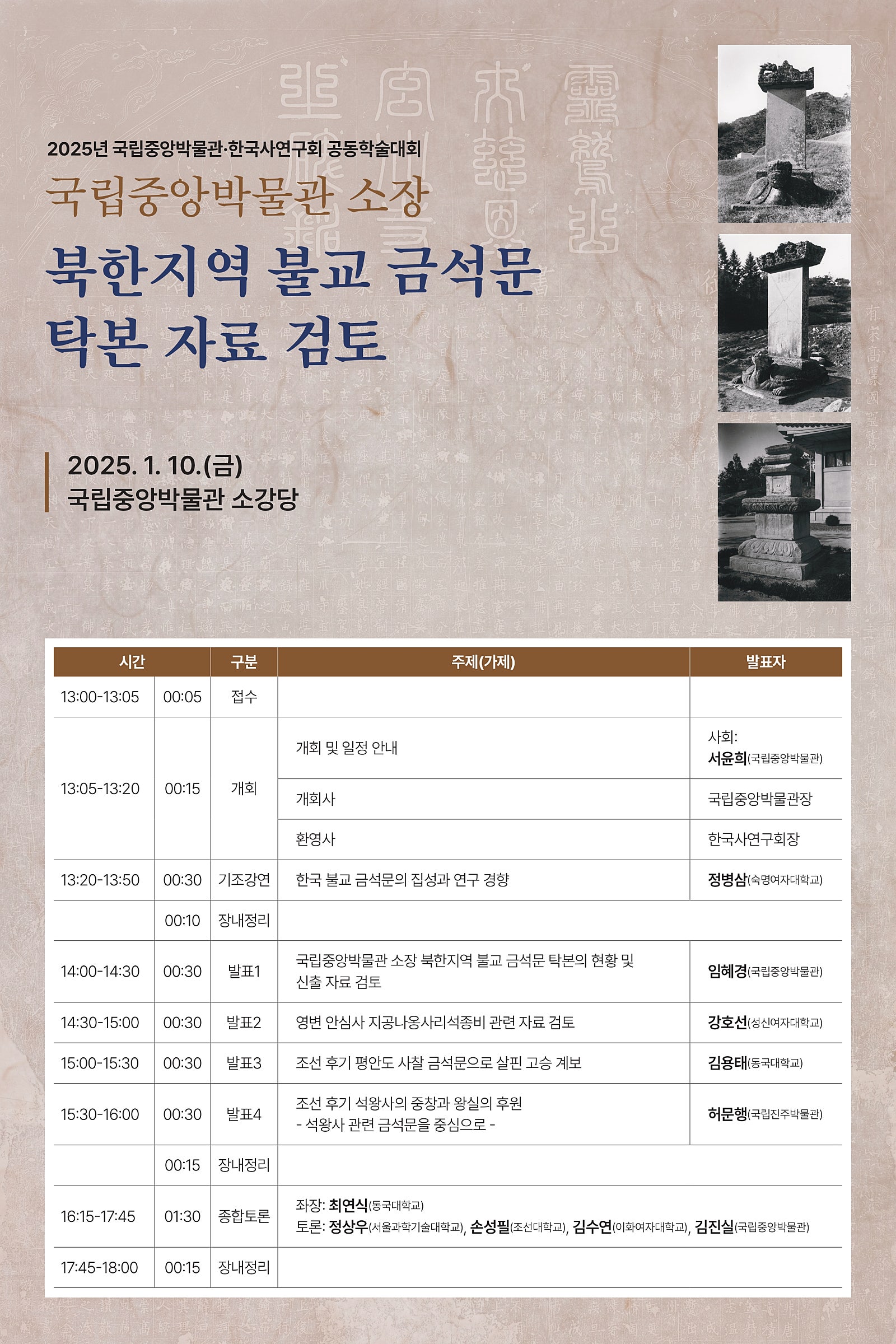 이번 학술대회는 국립중앙박물관 소장 북한 지역 불교 금석문 탁본 자료 검토를 주제로 개최됩니다.