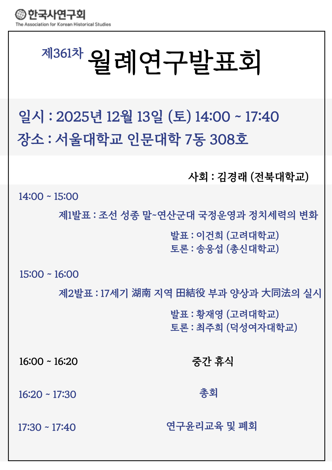 한국사연구회에서 12월 월례연구발표회 및 총회를 준비하였습니다.